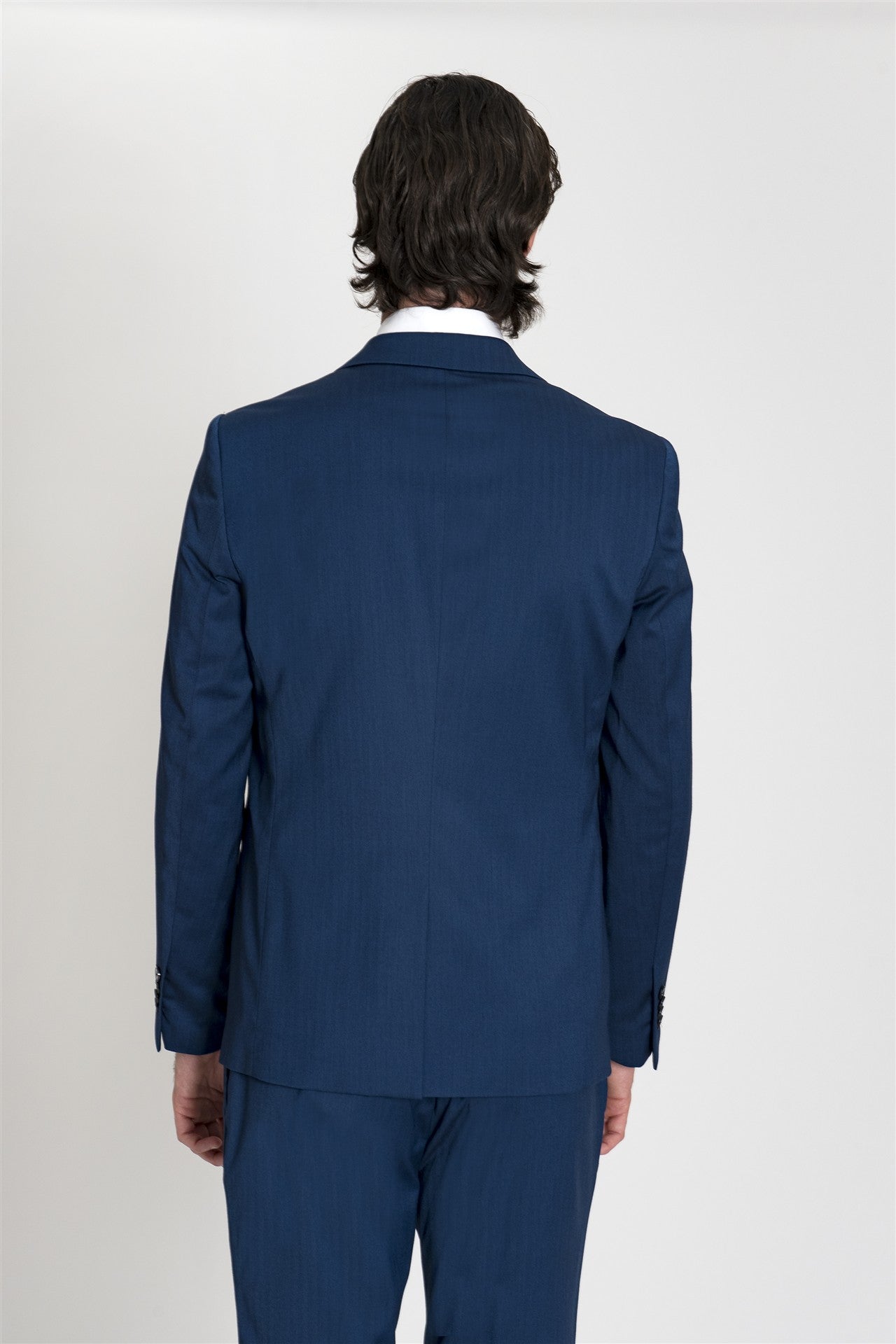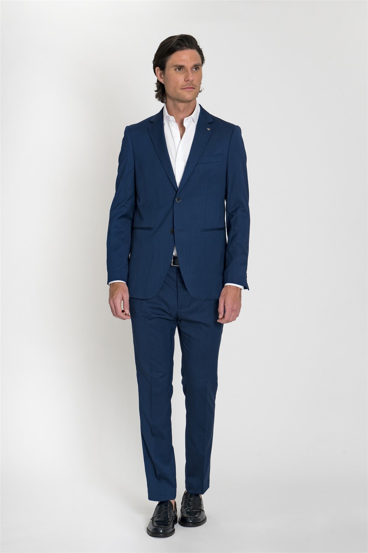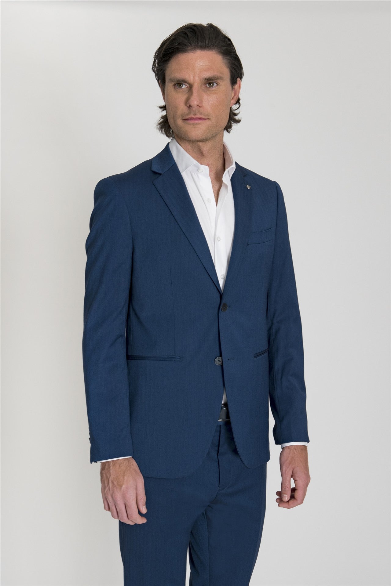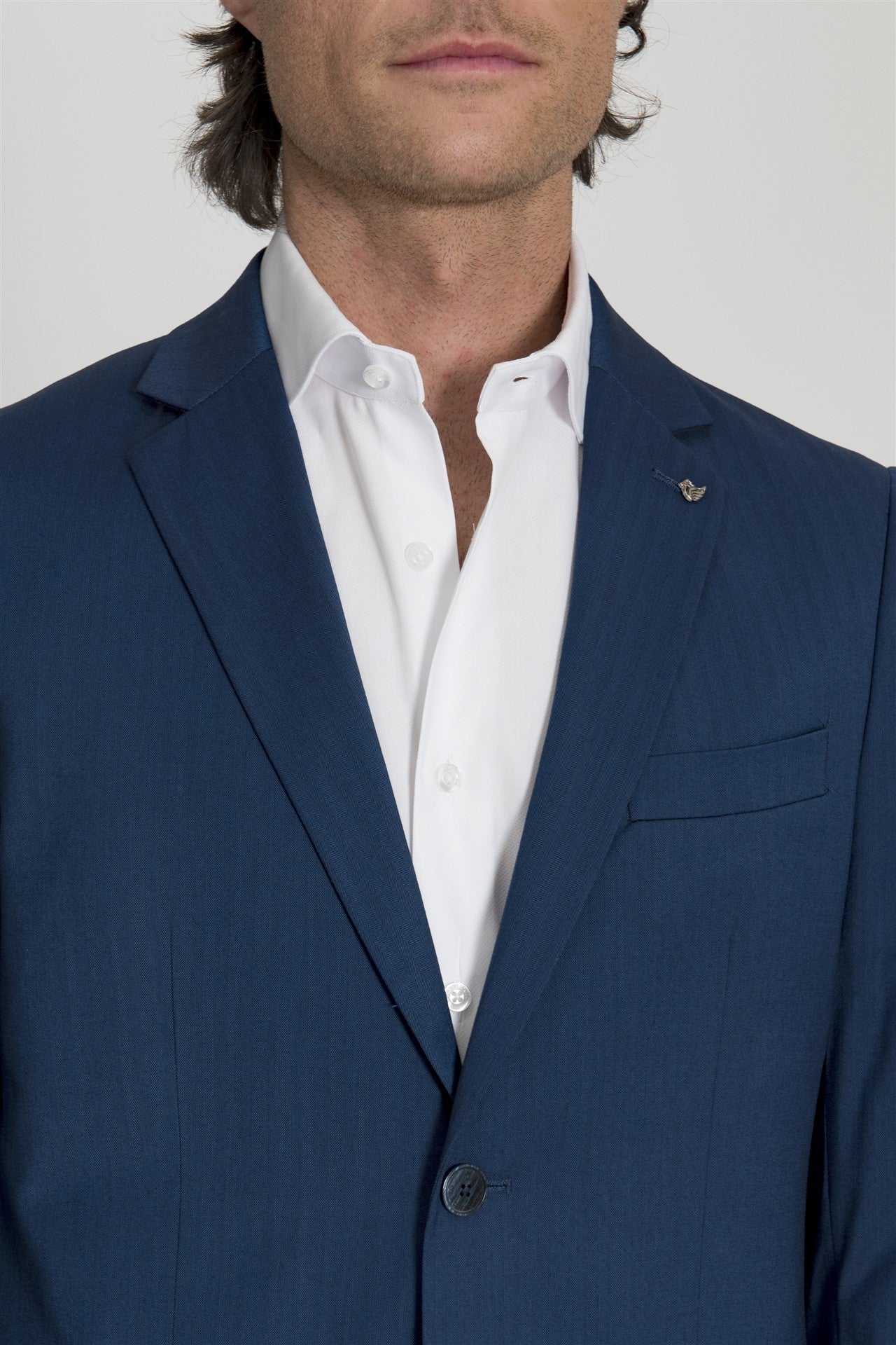 Questo completo si definisce per la sua eleganza formale impreziosita da una raffinata trama spigata del tessuto.