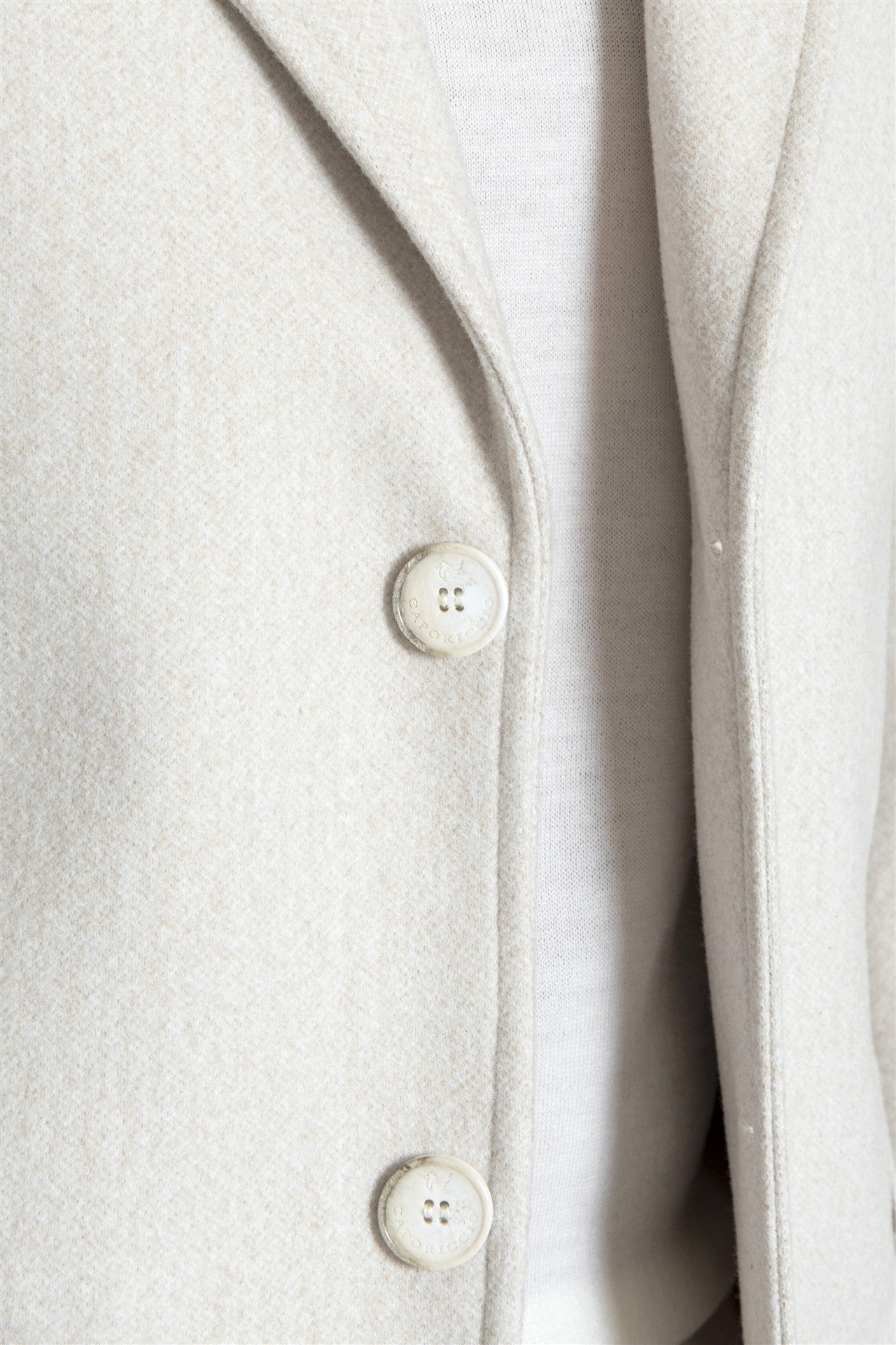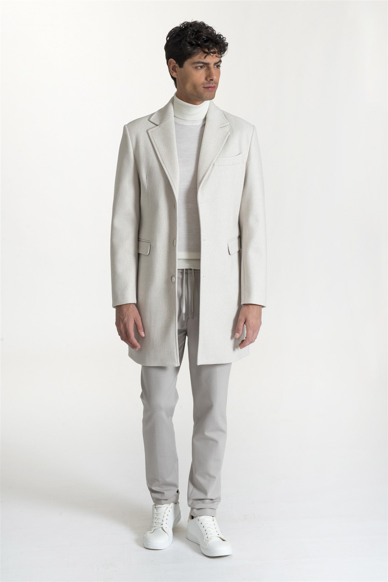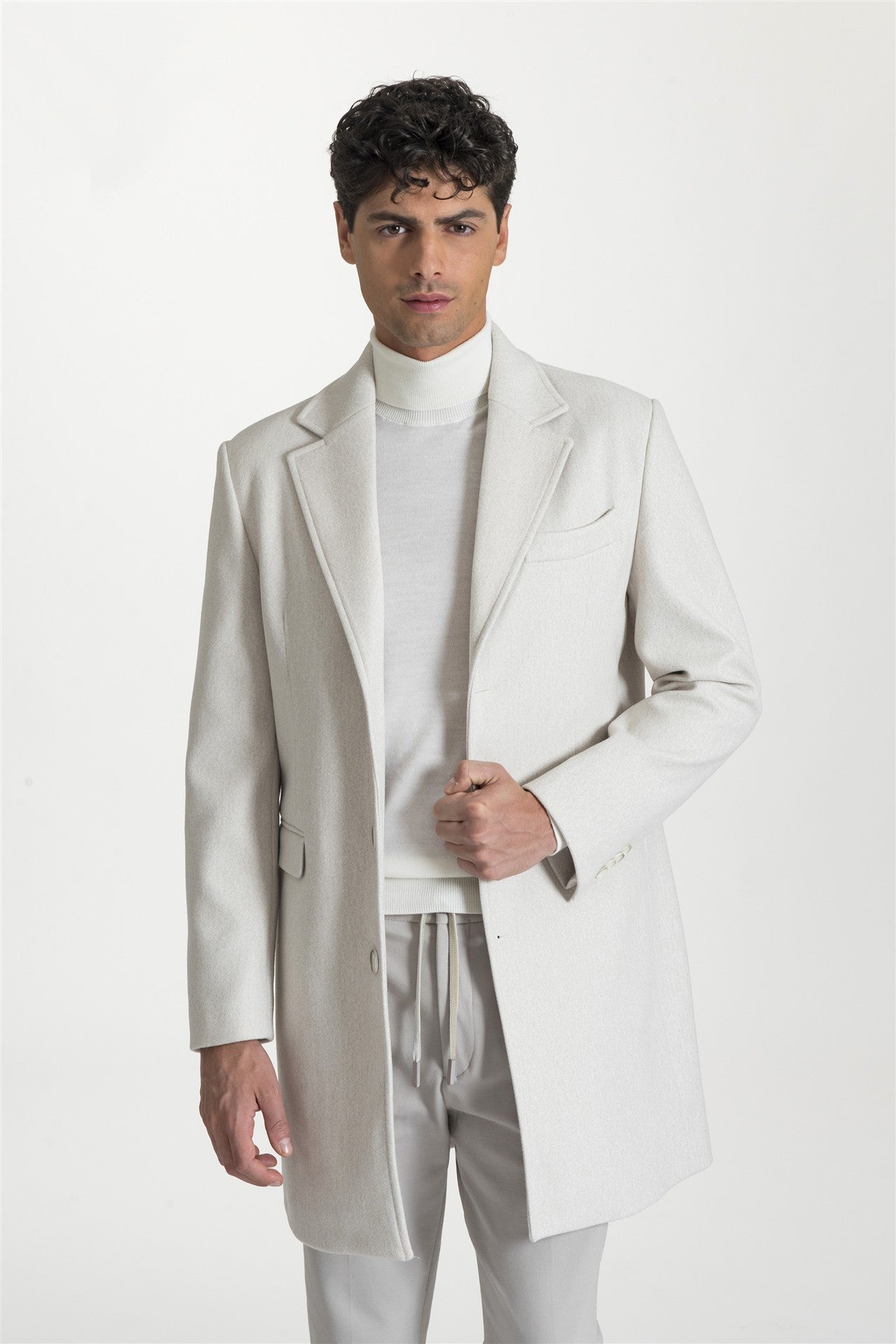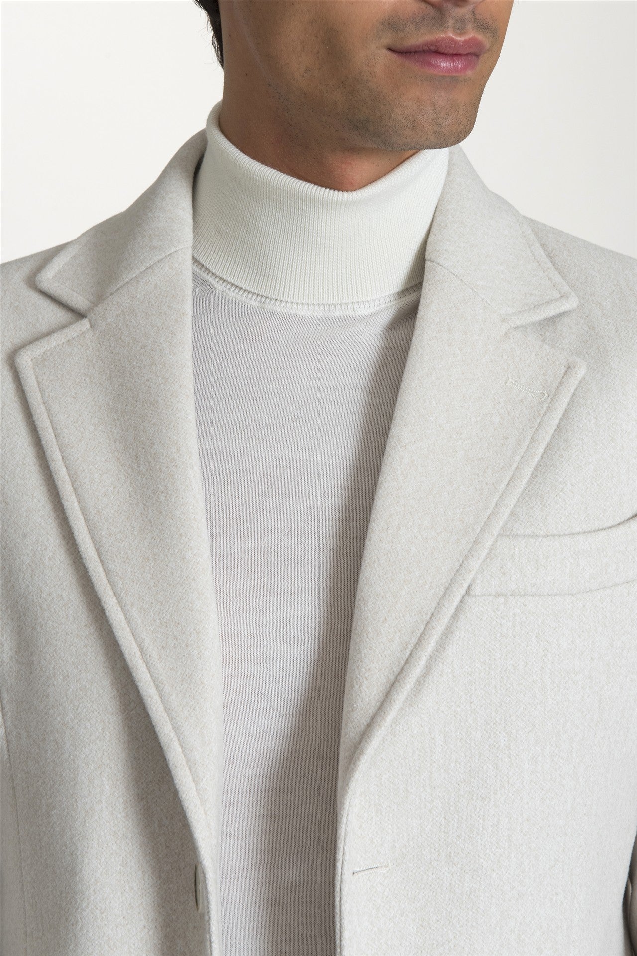Cappotto monopetto dalla linea pulita e intramontabile, realizzato in un pregiato panno di lana che offre calore e una struttura definita. Il design presenta revers classici, chiusura a tre bottoni e tasche a filetto con patta, rendendolo il capo spalla ideale per completare outfit formali o per dare un tocco sofisticato a un look casual con dolcevita bianco a contrasto.
