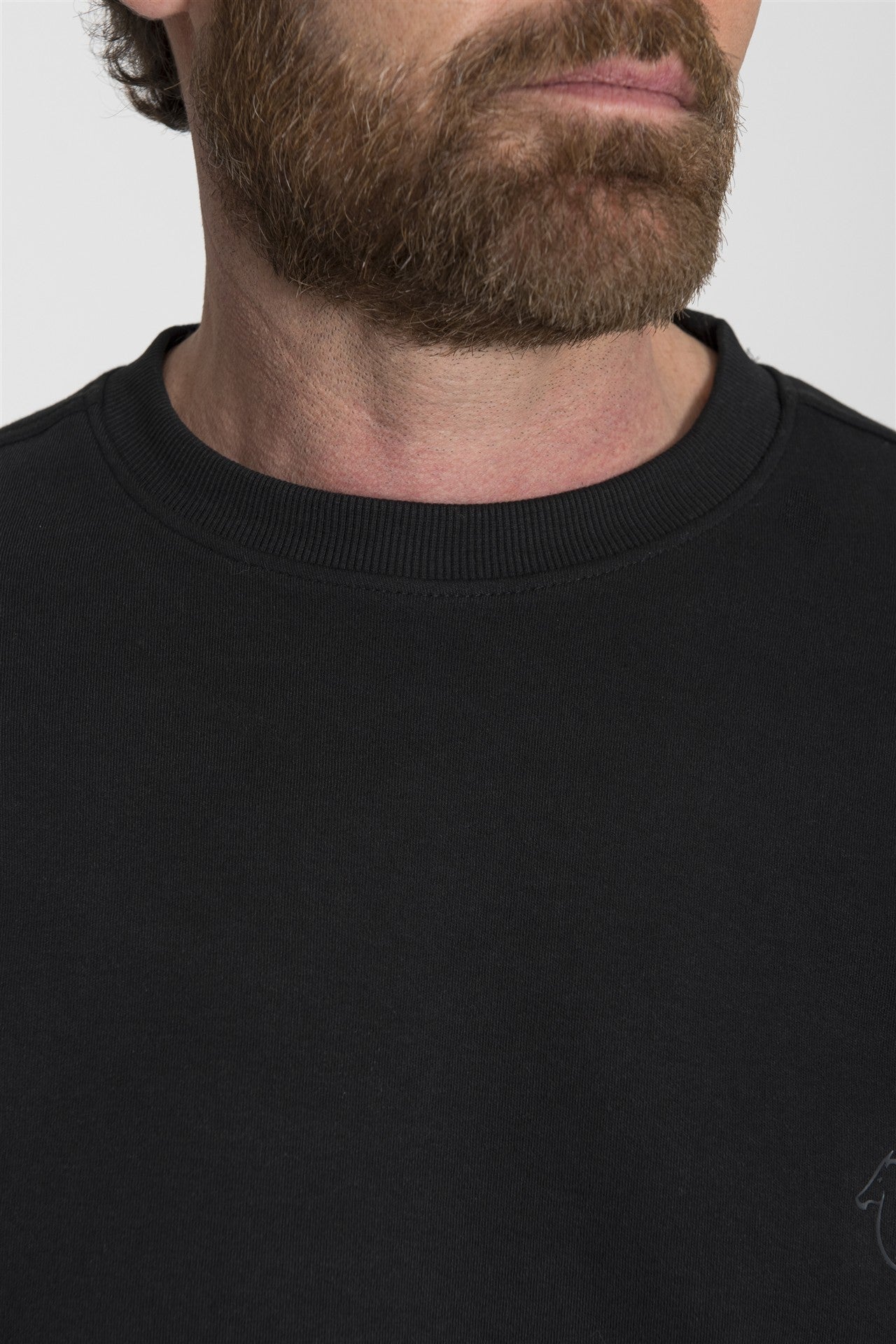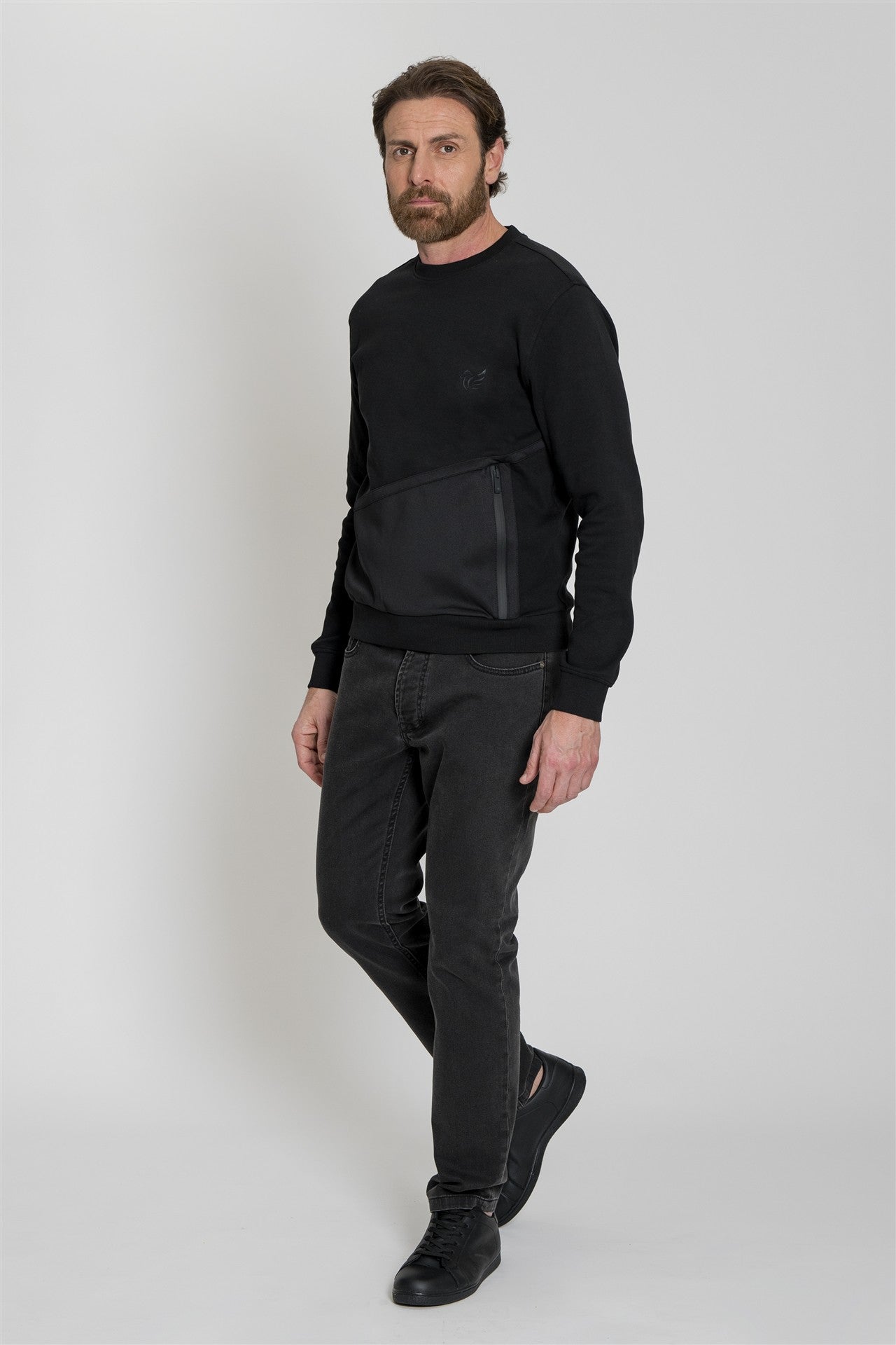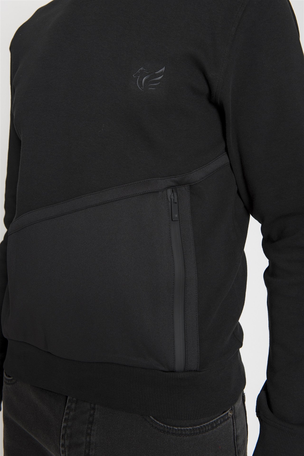 Capo d'abbigliamento versatile che unisce il comfort del jersey di cotone a un'estetica tecnica e moderna. Il design è caratterizzato da una costruzione classica a girocollo con polsini e fondo in maglia a costine, impreziosito da un'ampia tasca frontale asimmetrica con chiusura a zip termosaldata. La silhouette è rifinita da un logo ricamato in rilievo sul petto, rendendola una scelta ideale per un look streetwear sofisticato e funzionale.
