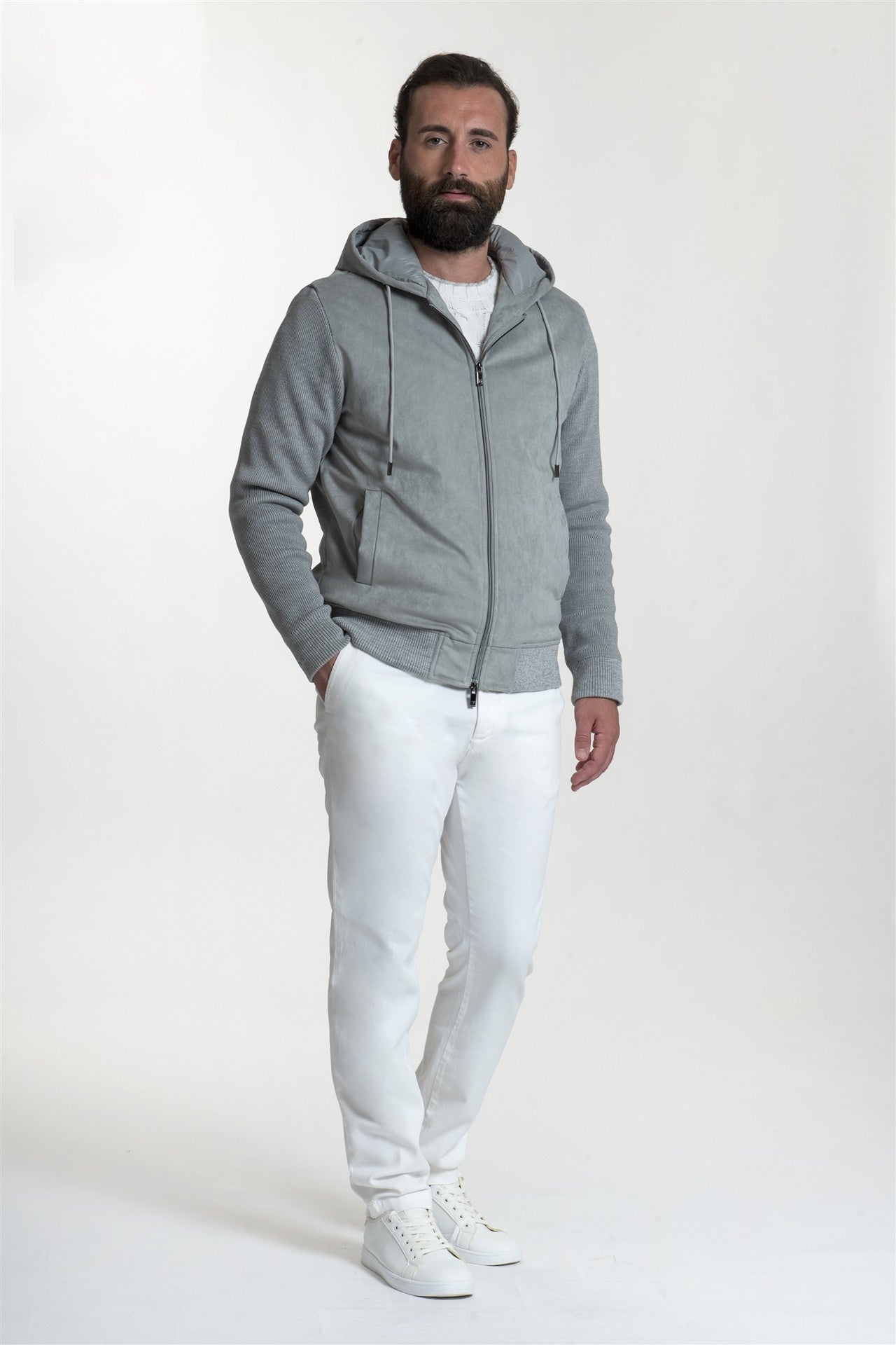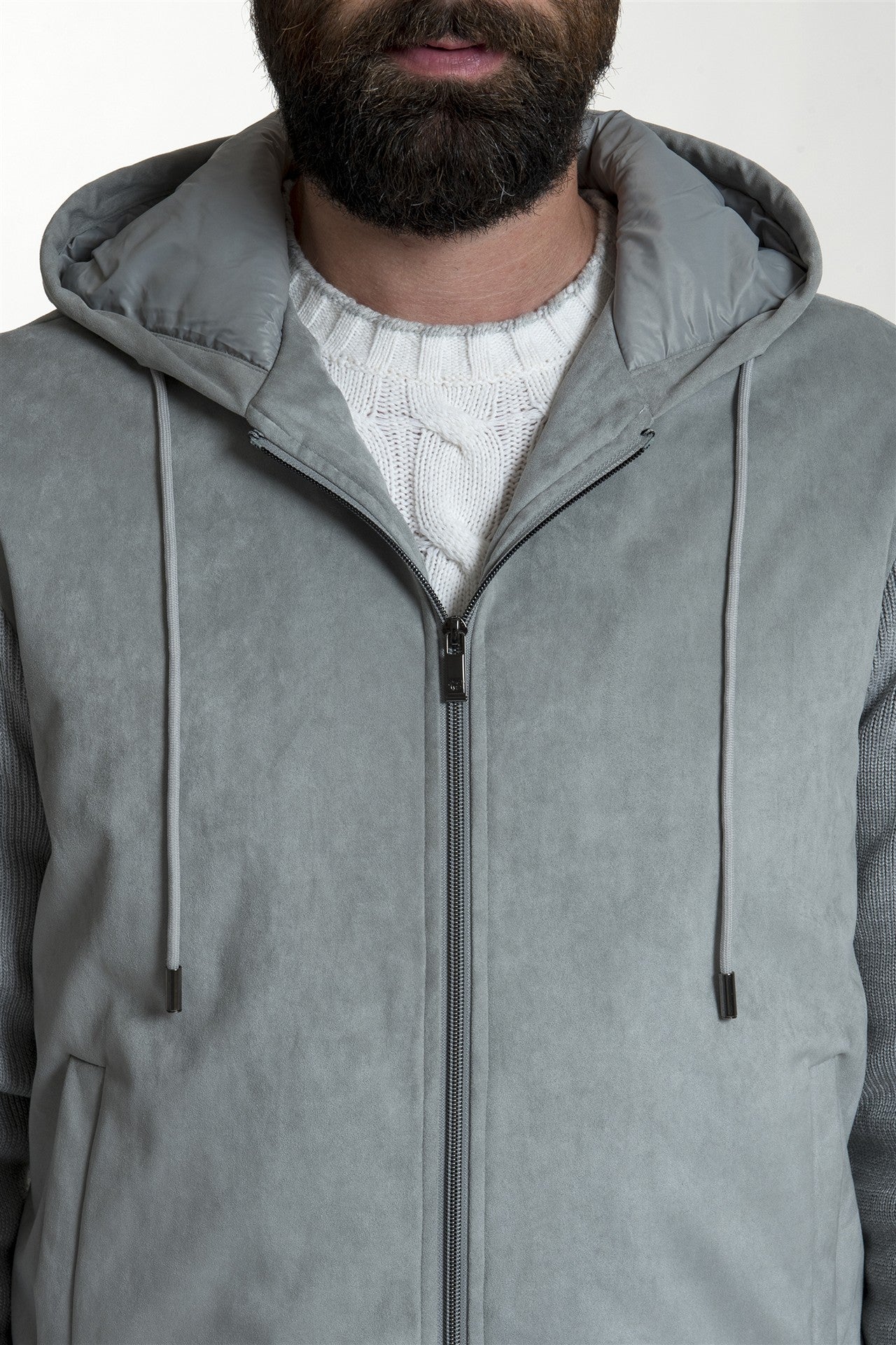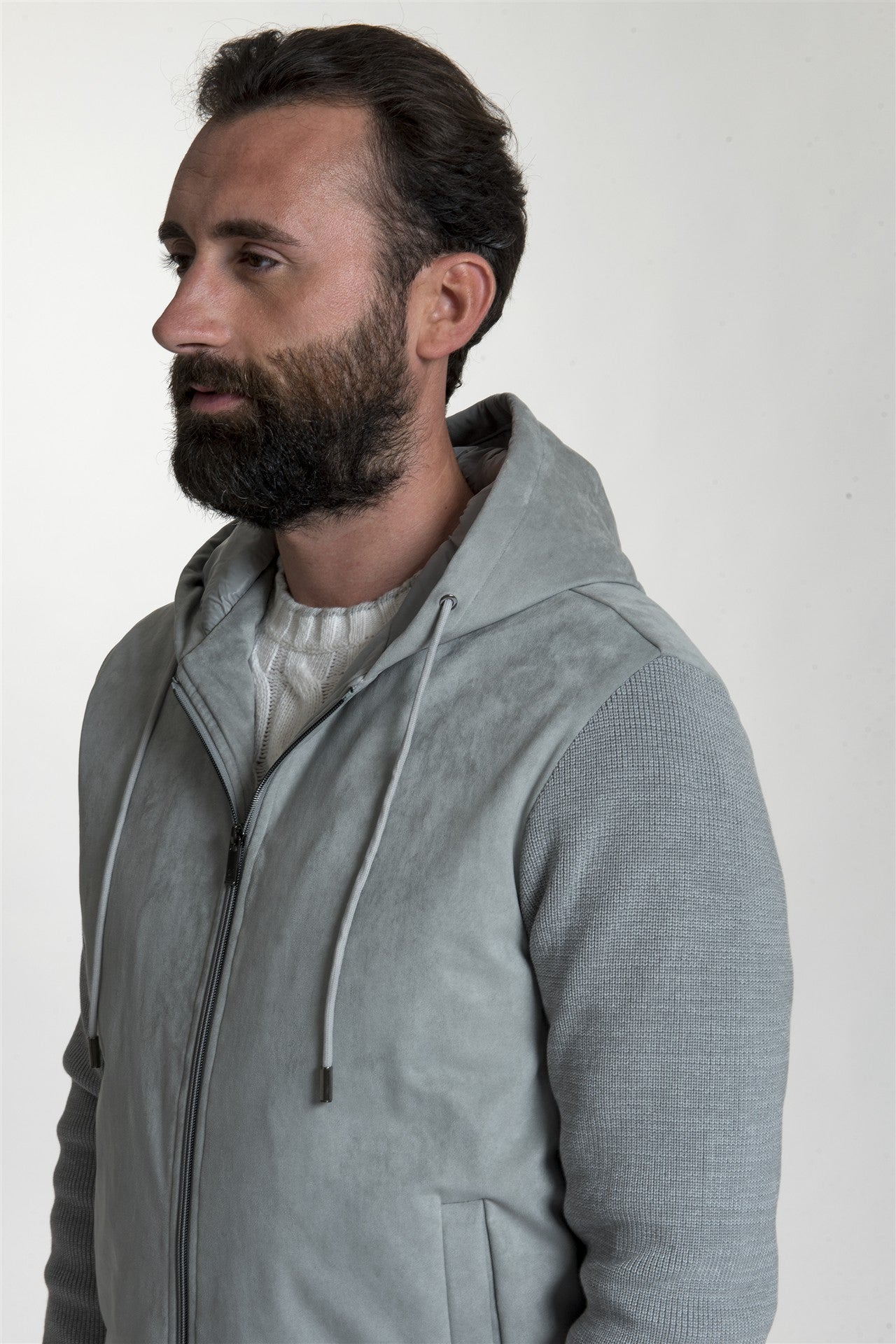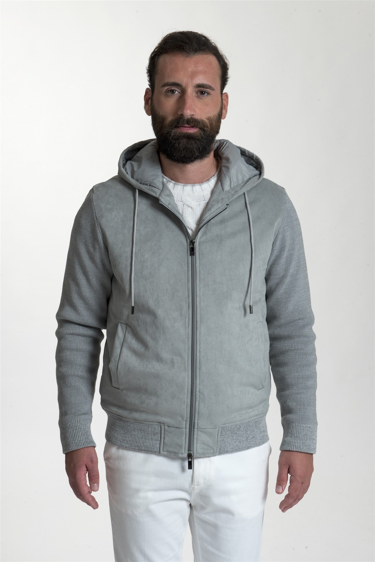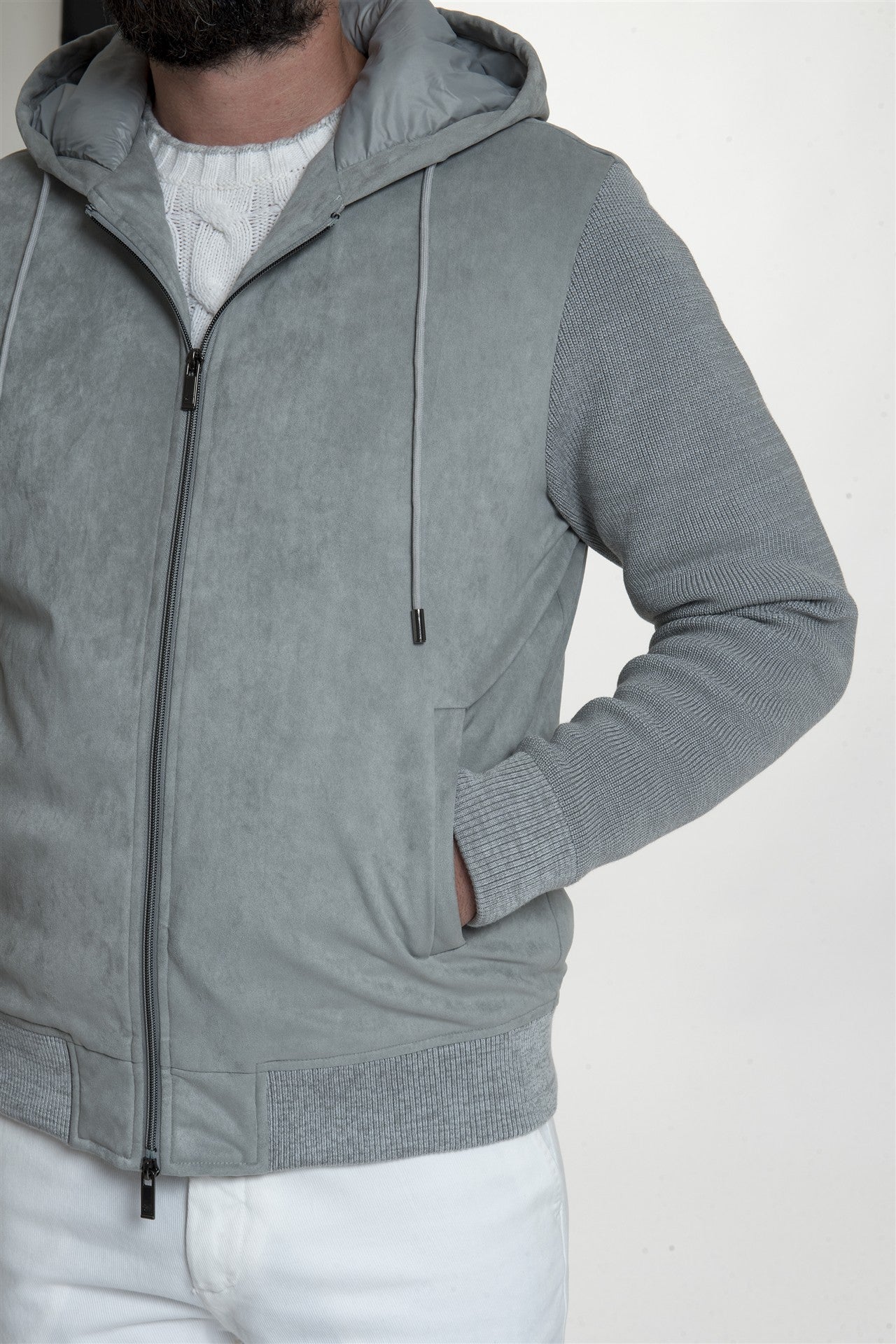 Capo dal design contemporaneo che combina diverse texture per un look urbano e ricercato. La parte frontale è realizzata in un materiale sintetico con effetto scamosciato, mentre le maniche e i bordi presentano una lavorazione in maglia a costine che assicura comfort e flessibilità. Il design è completato da un cappuccio regolabile con coulisse, chiusura frontale con zip a doppio cursore e pratiche tasche laterali a filetto.