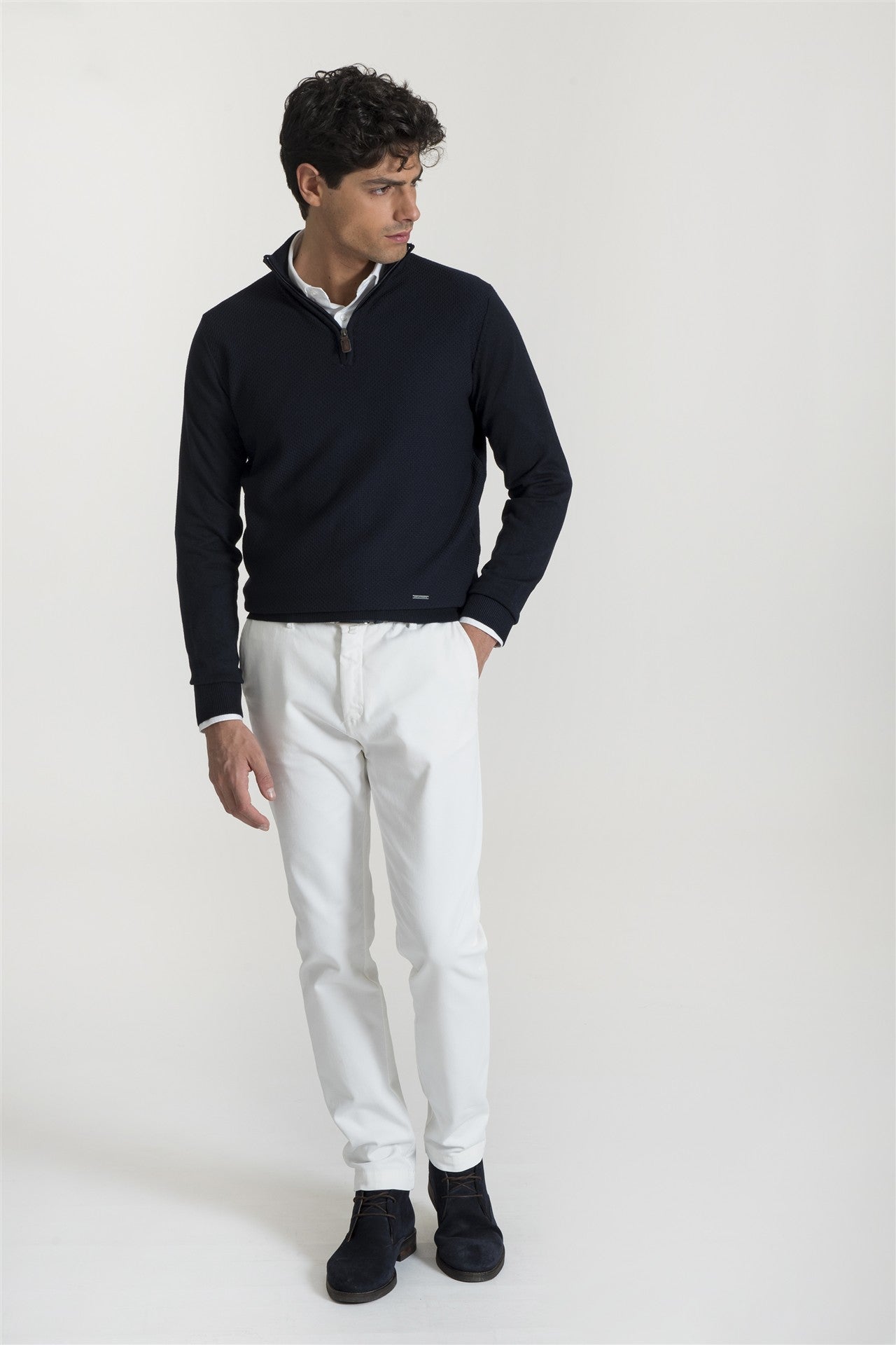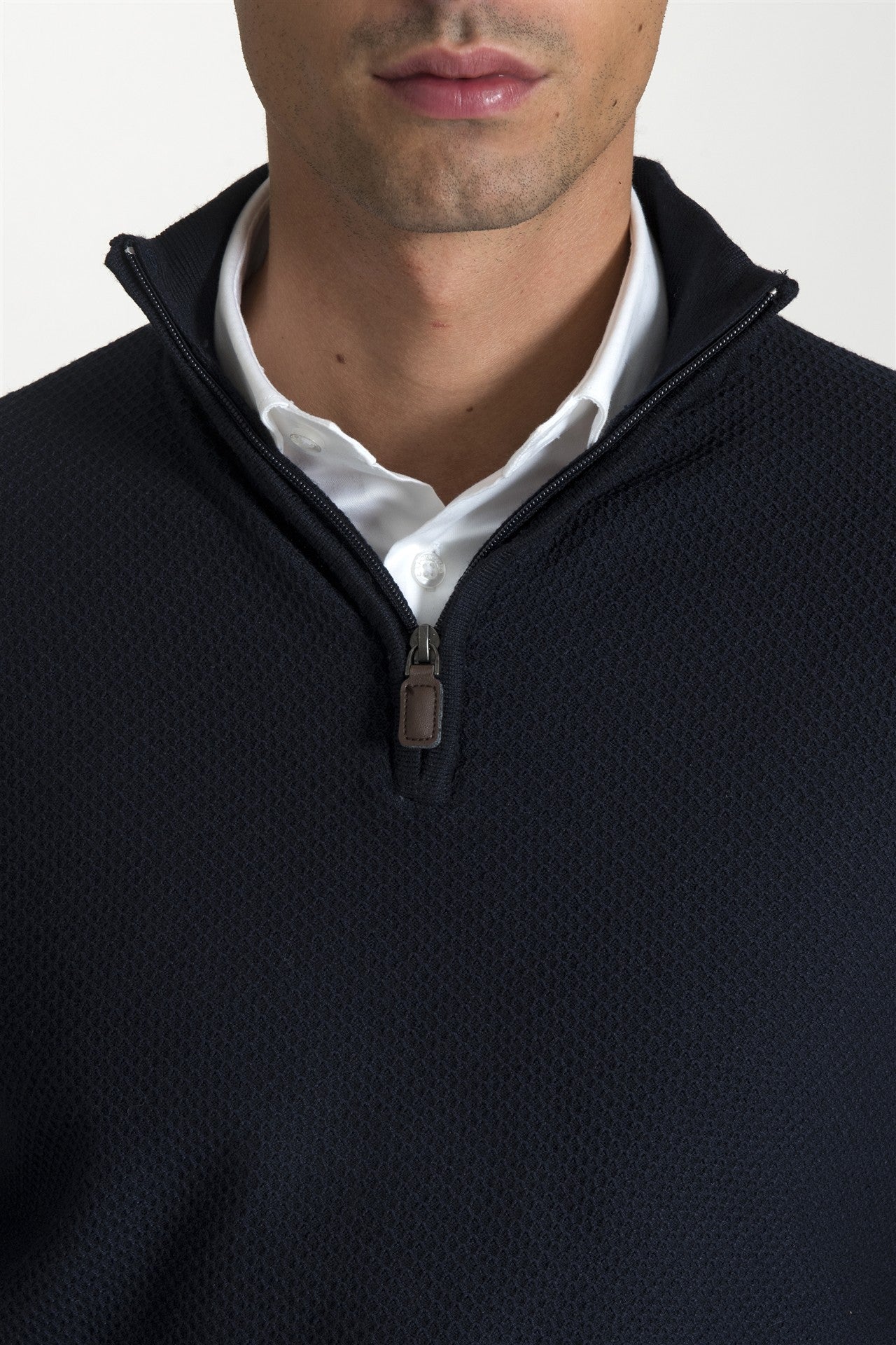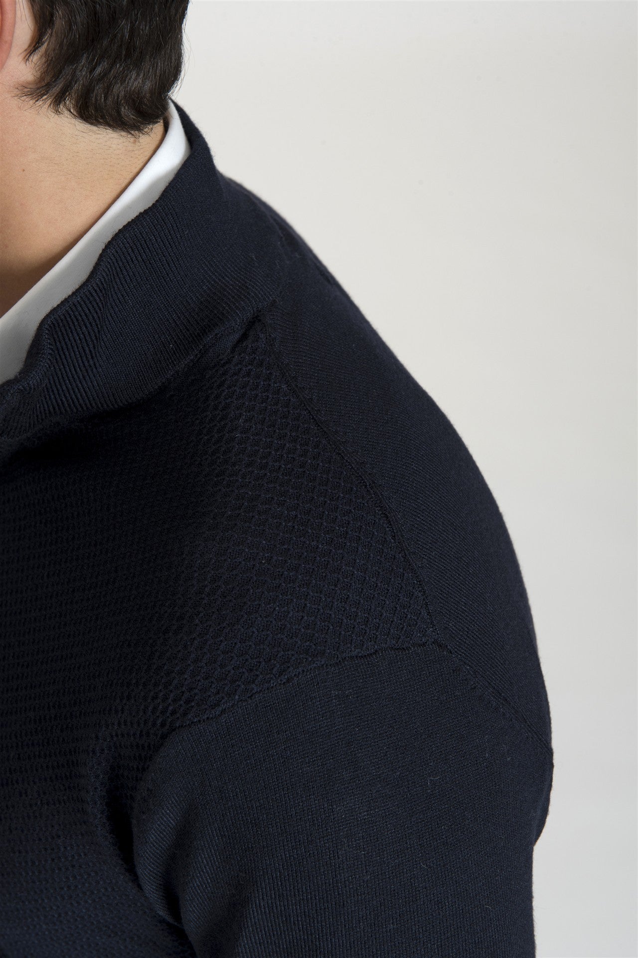 Maglia con collo alto e chiusura a mezza zip, realizzata in un mix di lana merino e tessuti tecnici. La lavorazione testurizzata unisce lo stile sportivo a un'estetica curata, rendendolo un capo dinamico adatto a diverse occasioni d'uso.