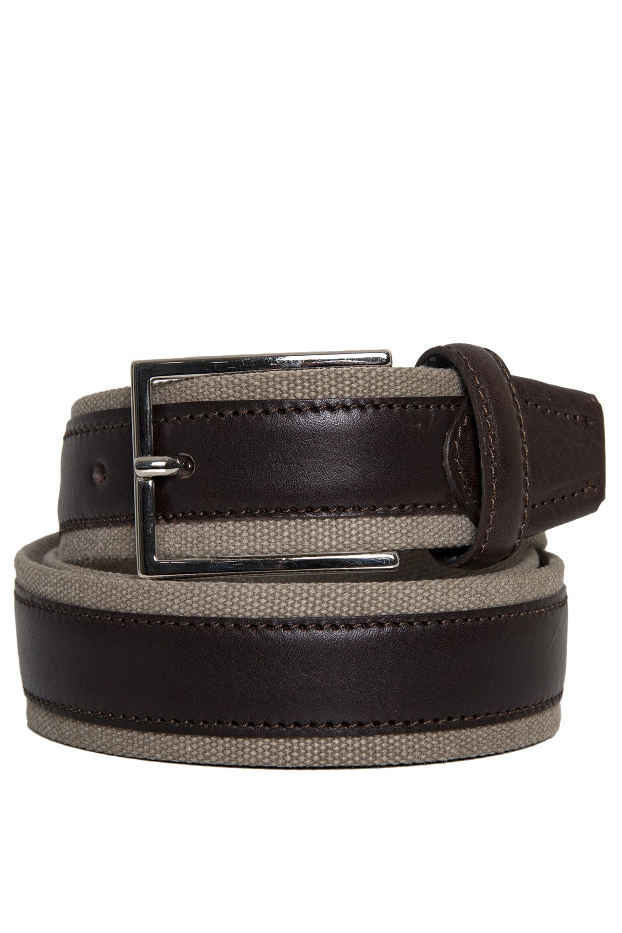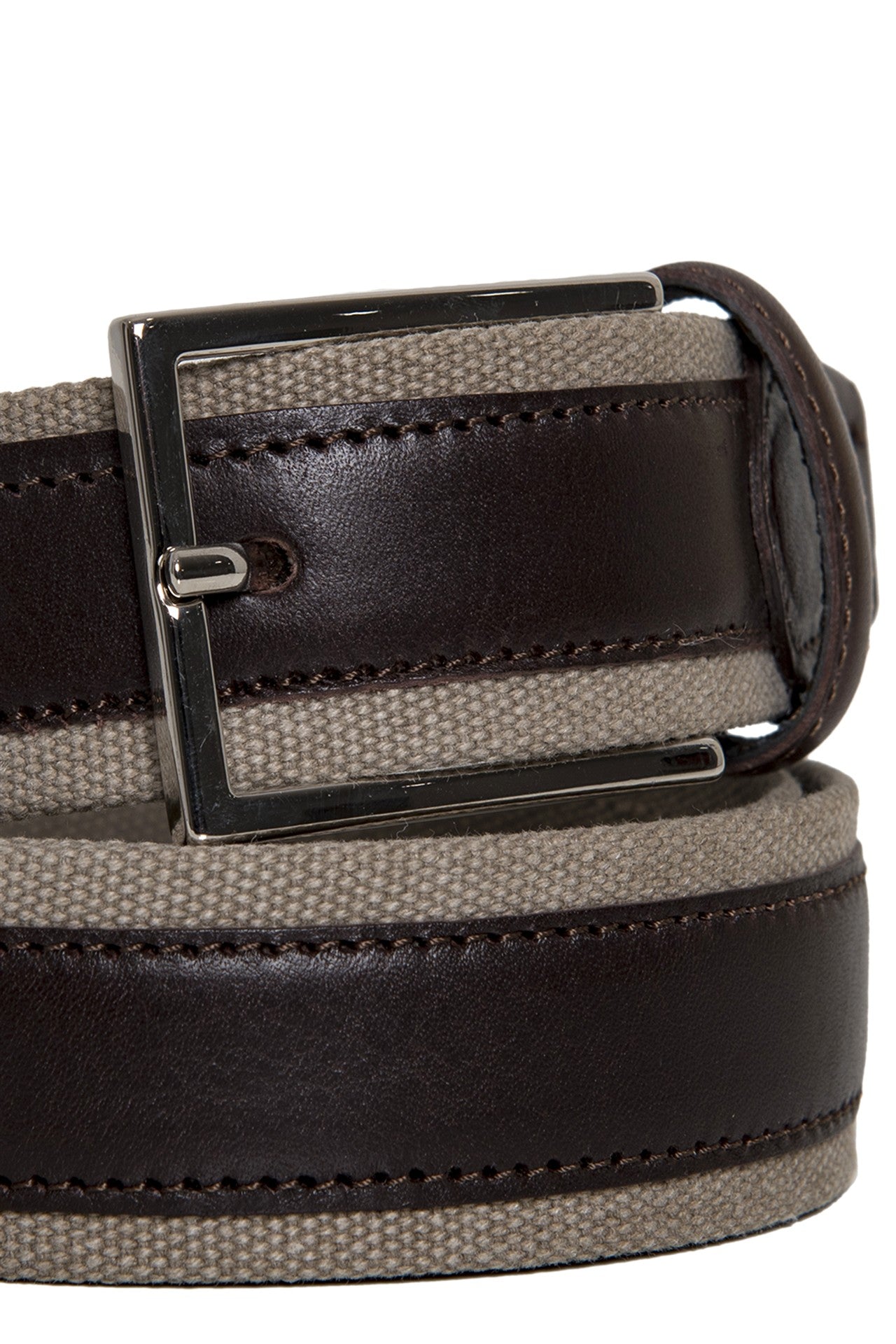 Accessorio dal carattere casual-chic che combina una base in robusta tela (canvas) blu con un inserto centrale in pelle liscia. La costruzione stratificata e le cuciture a vista tono su tono conferiscono alla cinta un aspetto tecnico e moderno, completato da una fibbia metallica squadrata lucida.