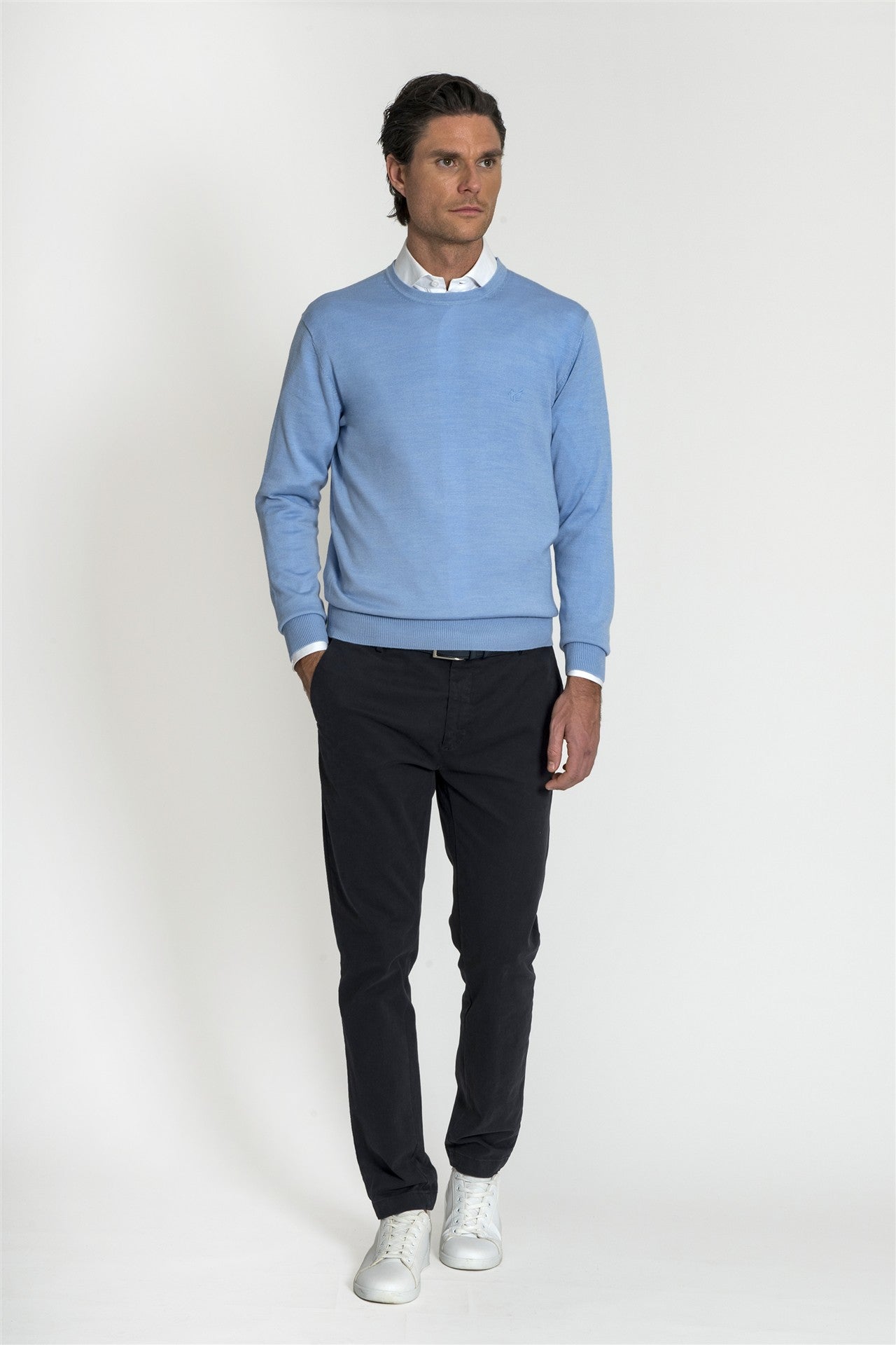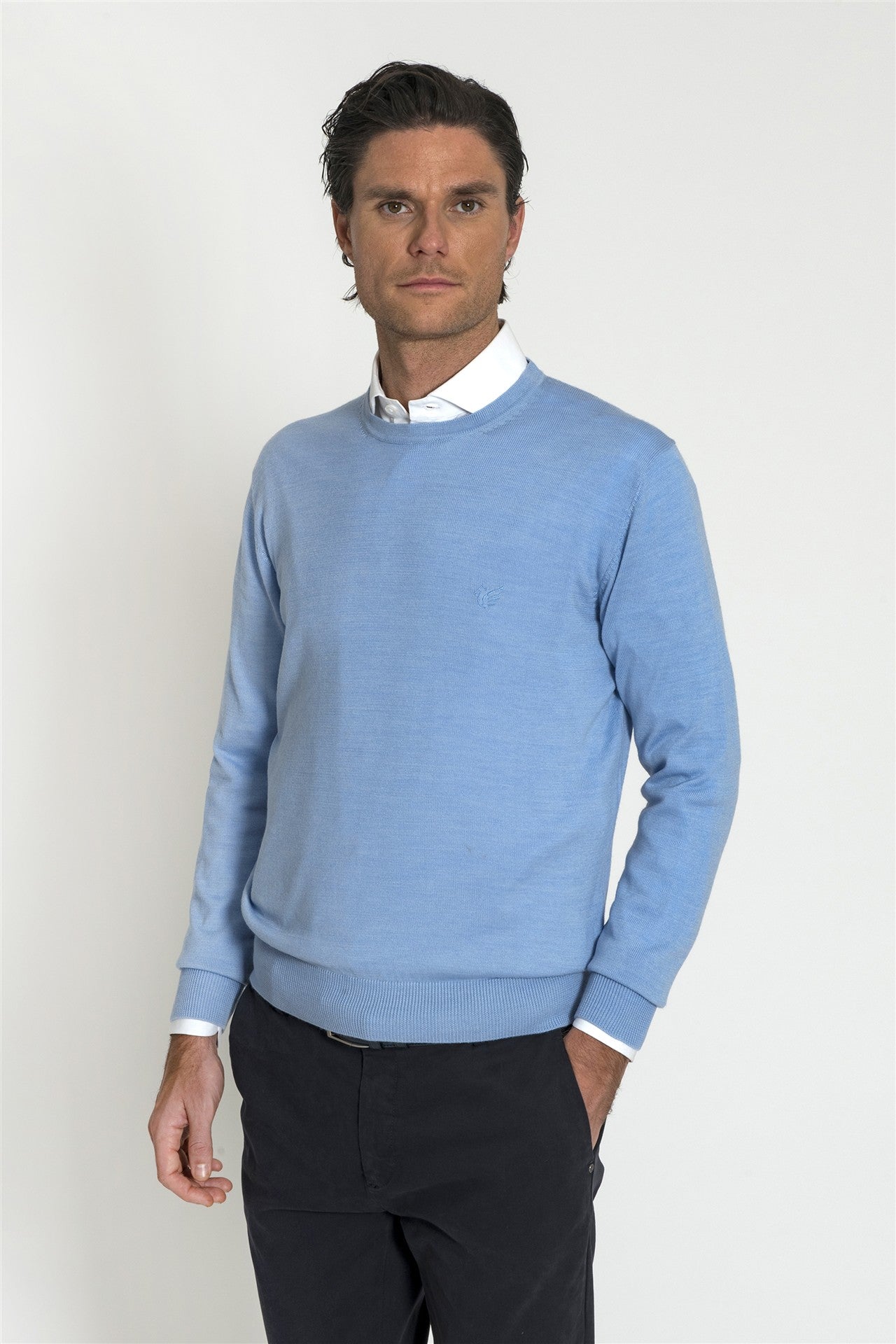 Girocollo Essential in Misto Merino - Maglia girocollo a manica lunga realizzata in un mix di fibre tecniche e lana merino, pensata per chi cerca un capo pratico, caldo e resistente. Il design pulito e la vestibilità asciutta la rendono un pezzo jolly, estremamente facile da abbinare sia sopra una camicia per un look professionale, sia da sola per contesti più informali.
