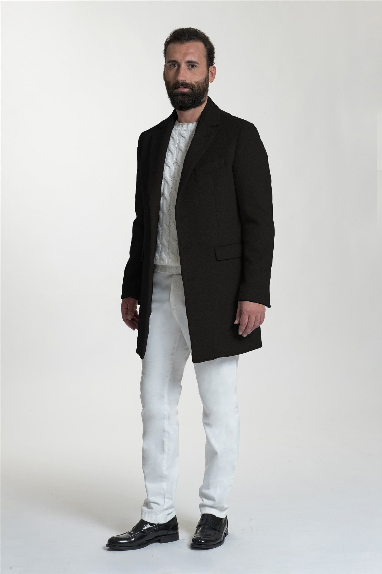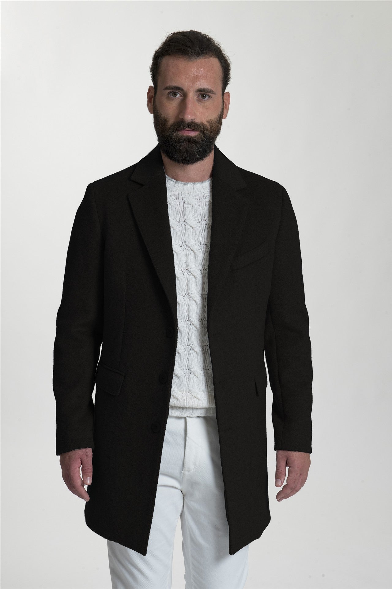 Cappotto monopetto dalla linea pulita e contemporanea, realizzato in una pregiata miscela di lana che garantisce calore e una struttura impeccabile. Il design presenta classici revers a lancia, chiusura a tre bottoni e tasche laterali con patta, rendendolo un capo esterno sofisticato e versatile, perfetto da sovrapporre a maglieria a trecce o abiti formali per un look invernale distintivo.
